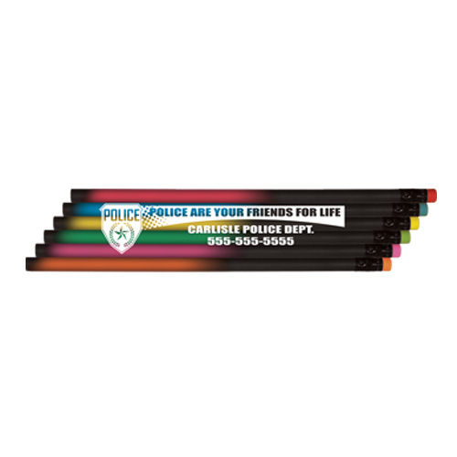 Pencils shipped in 6 assorted colors; yellow, red, pink, orange, green, blue. Imprint in White.