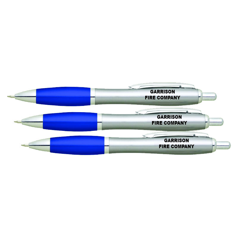Imprinted Ballpoint Pen Silver w/ Blue GripFeatures a click action retractable ballpoint pen with black ink.W120CU Details...