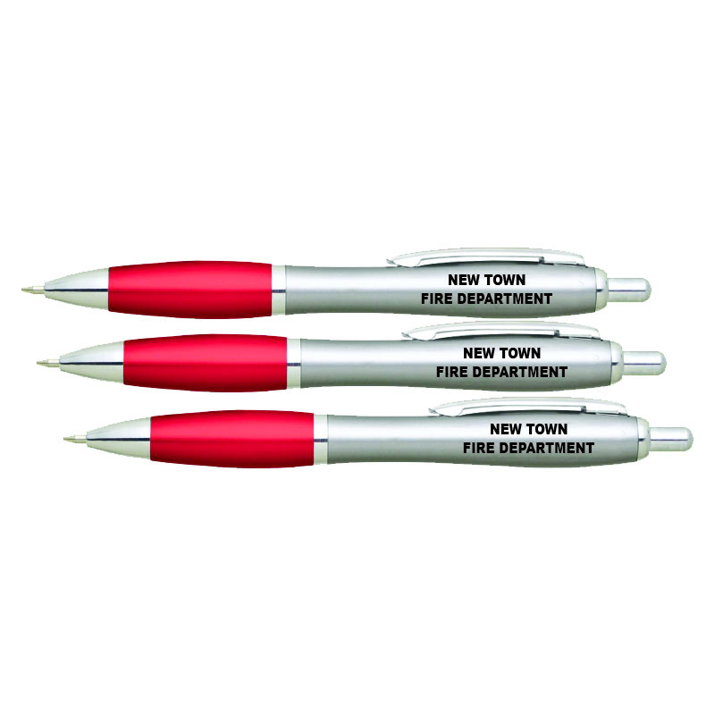 Imprinted Ballpoint Pen Silver w/ Red GripFeatures a click action retractable ballpoint pen with black ink.W120CR Details...