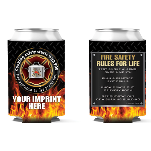 Back of can hugger displays numerous fire safety rules.