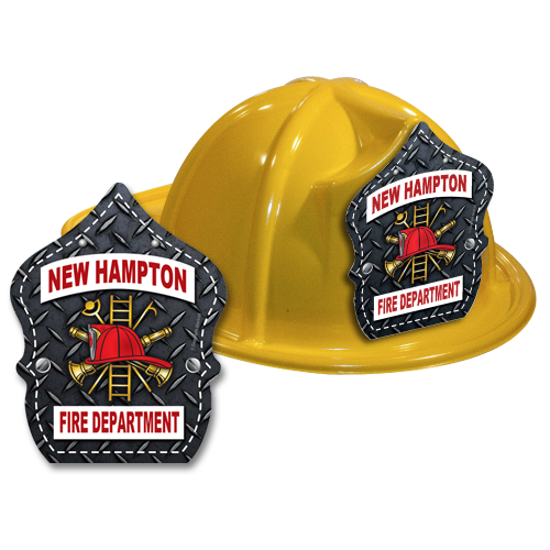 Custom Diamond Plate Shield on Yellow Fire Hat