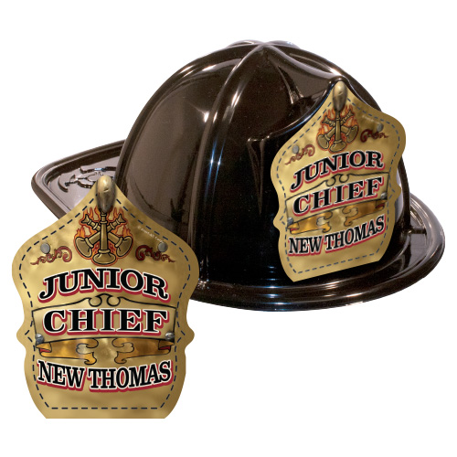 IMP. FIRE HAT - BLACK - GOLD JR. CHIEF SHIELD Watch their eyes light up when you give them their very own fire chief hat. These lightweight plastic hats are full size.Best quality plastic and shield in the USA456B9 Details...