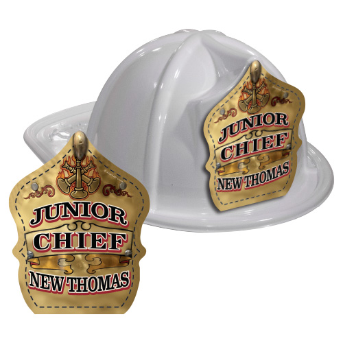 IMP. FIRE HAT - WHITE - GOLD JR. CHIEF SHIELD Watch their eyes light up when you give them their very own fire chief hat. These lightweight plastic hats are full size.Best quality plastic and shield in the USA456W9 Details...