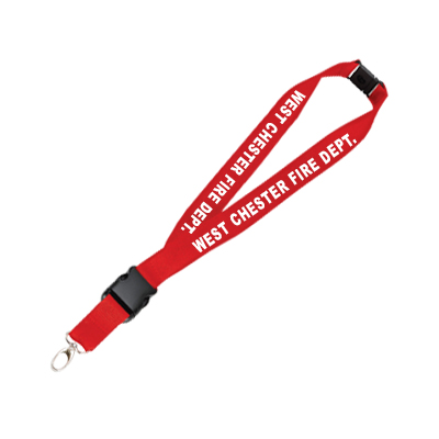 Polyester 20in lanyard includes breakaway neck clip and detachable plastic clip with wide metal swivel hook.