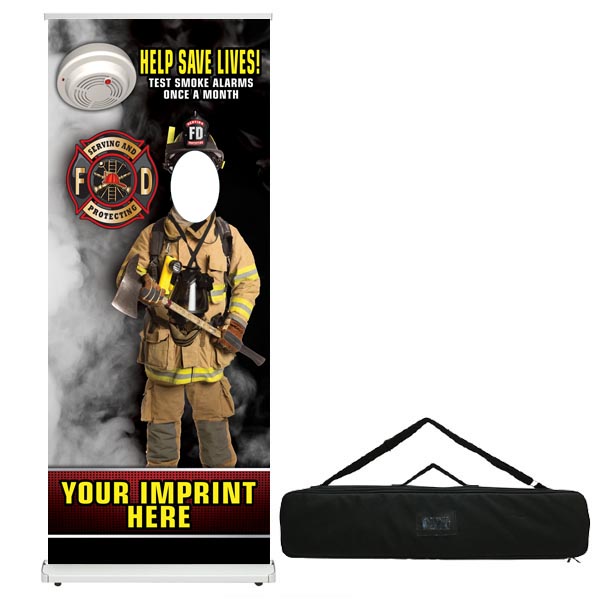 The Firefighter photo prop will be a great addition for your display and kids will love them! This photo prop is made out of vinyl and has a roll up metal stand and bag included. Made for both indoor and outdoor use. This photo prop is free standing at the size of 33"W x 80"H