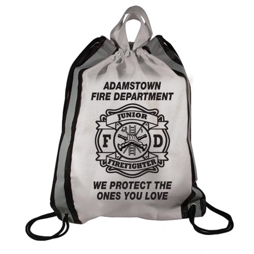 Imprinted White Jr. FF Maltese Reflect Drawstring BackpackThese drawstring bags are an excellent way to promote your fire department or organization. And they have reflective stripes, helping kids be seen in the dark.992WH11 Details...