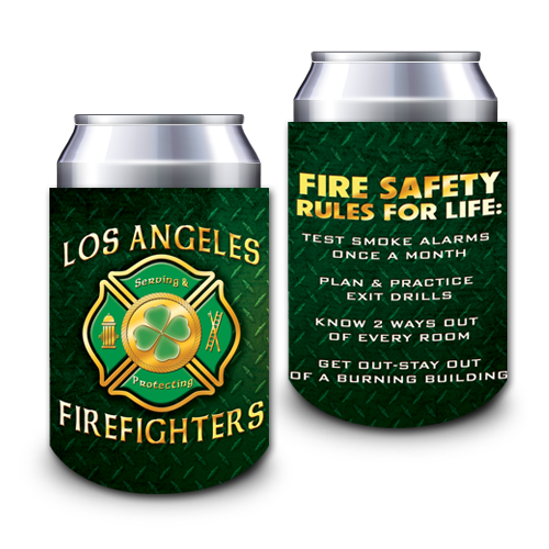 The front of this full color can hugger shows a Maltese cross shamrock design, while the back displays "Fire Safety Rules."