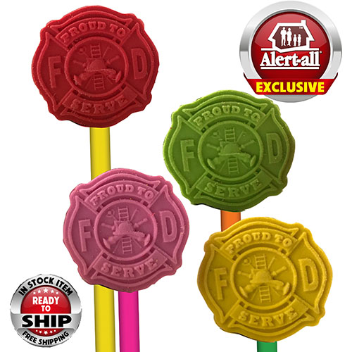 Shipped in assorted colors of red, yellow, pink and green and assorted shapes of maltese cross, fire hydrant, fire truck, and fire hat.
