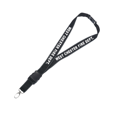 Polyester 20in lanyard includes breakaway neck clip and detachable plastic clip with wide metal swivel hook.
