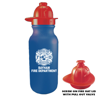 These bike bottles come with molded fire hat lids, making them special and unique. Lid screws on and valve pulls out of the top for easy drinking.