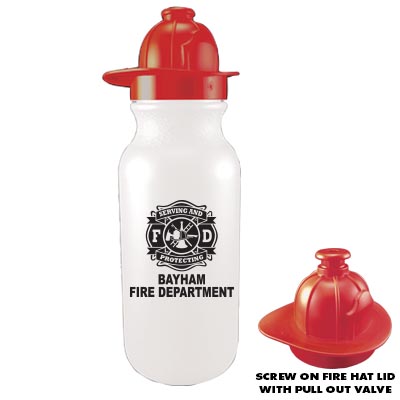 These bike bottles come with molded fire hat lids, making them special and unique. Lid screws on and valve pulls out of the top for easy drinking.