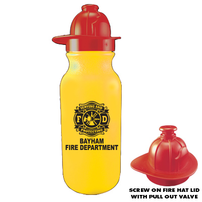 These bike bottles come with molded fire hat lids, making them special and unique. Lid screws on and valve pulls out of the top for easy drinking.
