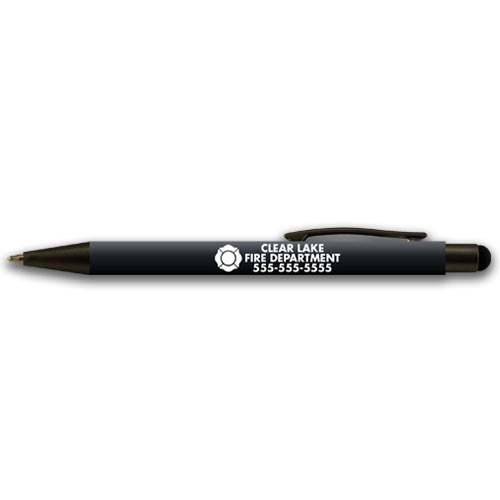 These sleek pens feature soft touch-feel barrels in bold matte colors. Pen is retractable with metal accents and stylus tip at top of plunger.