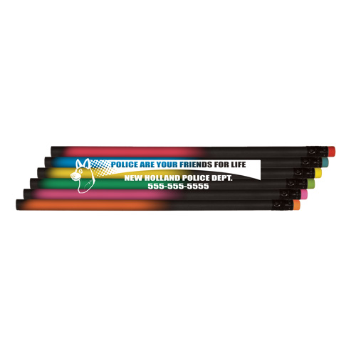 Pencils shipped in 6 assorted colors; yellow, red, pink, orange, green, blue. Imprint in White.