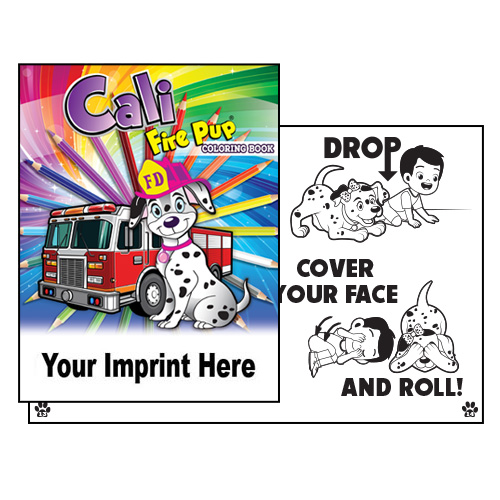 This 18-page Coloring Book featuring Cali Fire Pup is very popular with children in kindergarten and first grade. Lots of pages to color, pages of activities and 10 fire safety tips for the entire family. Space available on the front cover for imprint.
