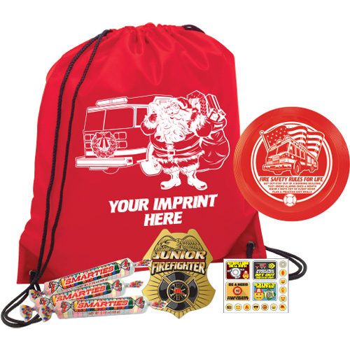 /Fire Prevention/Fire Safety Kits/Custom Fire Safety Kits/Imprinted Cinch Backpack - Red - w/ Mini Flyer Pack - Santa & Fire Truck