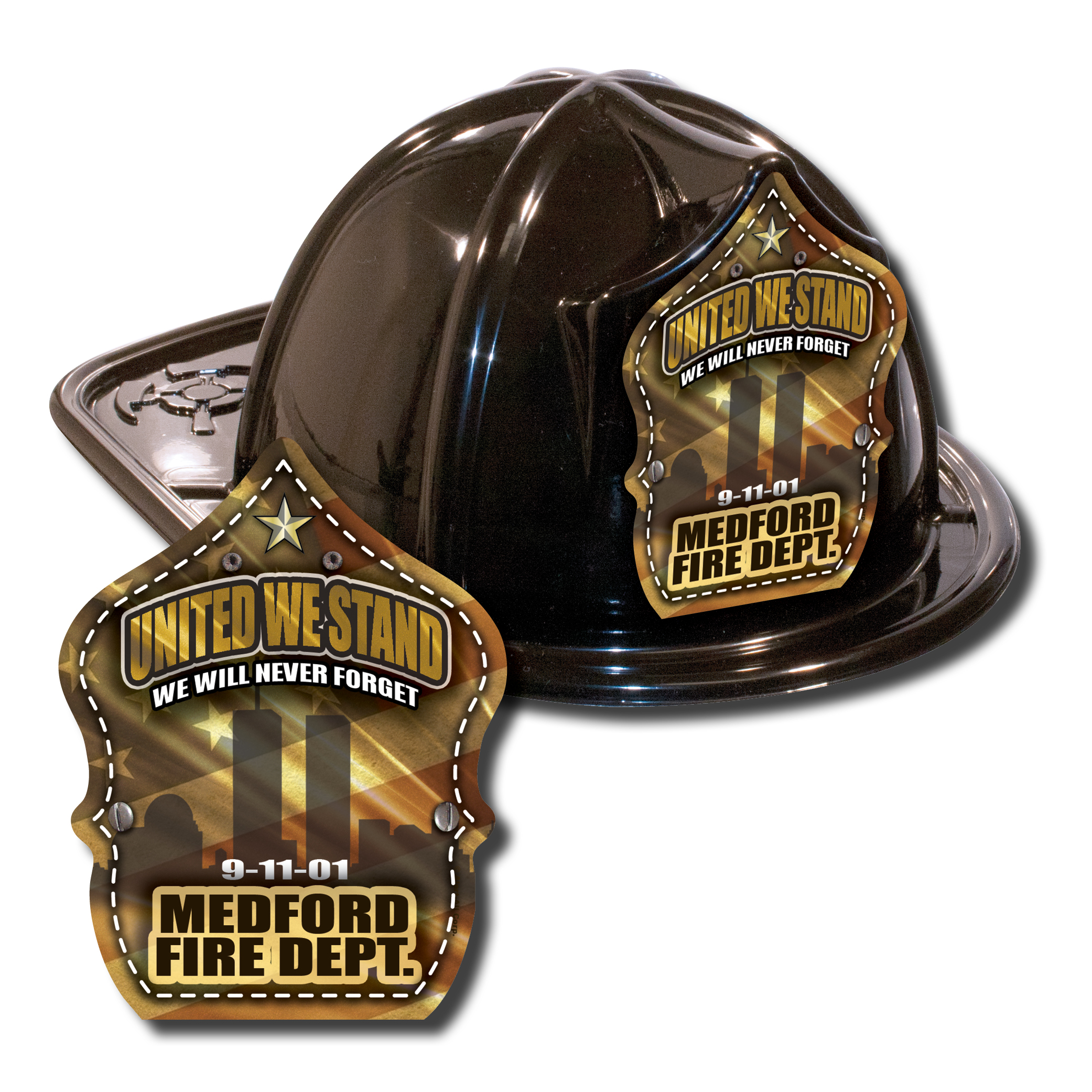 Imprinted Fire Hat - Black - 9/11 Gold Flag Shield