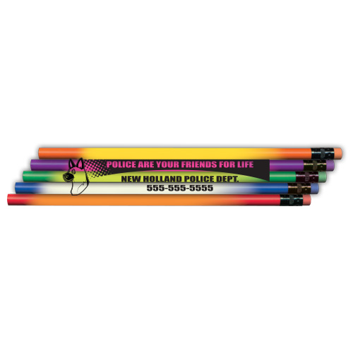Pencils shipped in 5 assorted colors; orange, green, purple, red, and blue. Imprint in Black.