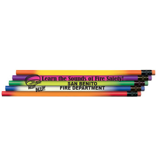 Pencils shipped in 5 assorted colors; orange, green, purple, red, and blue. Imprint in Black.