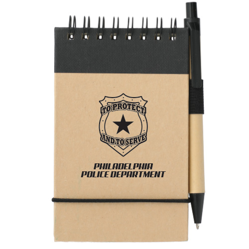 Jotter features a recycled cover and includes a matching recycled ballpoint barrel pen, elastic band closer, pen loop, and 60 ruled pages.