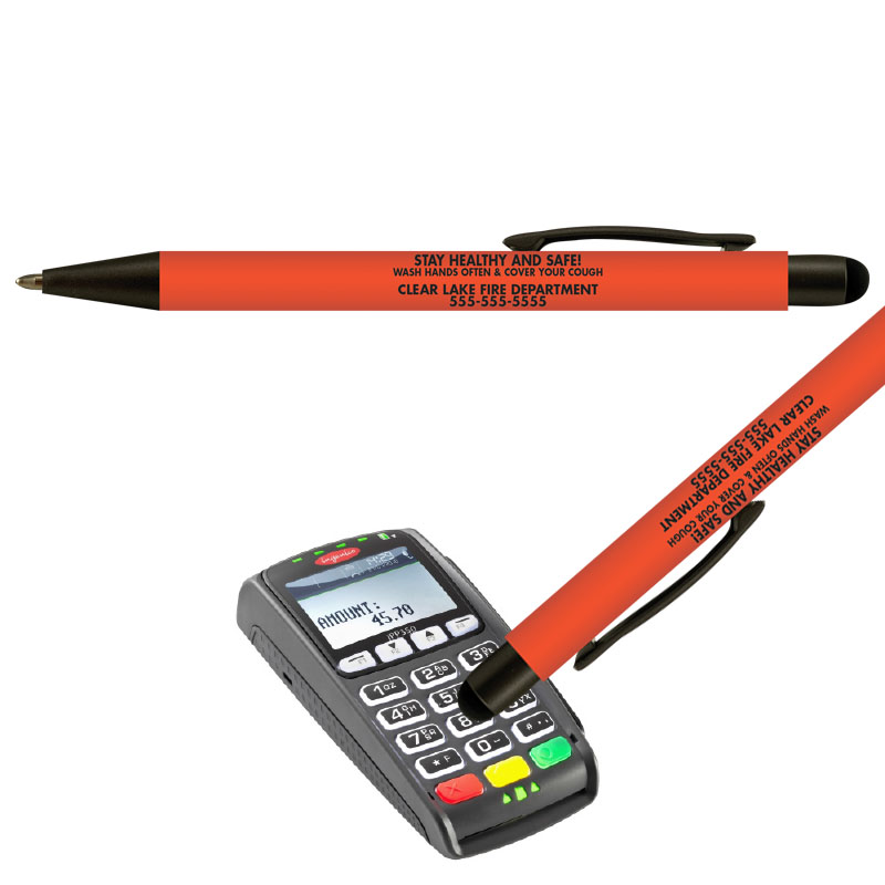 These sleek pens feature soft touch-feel barrels in bold matte colors. Pen is retractable with metal accents and stylus tip at top of plunger.