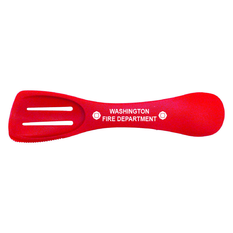 Universal tool features a spoon, slotted spoon, turner and serrated edge for a variety of kitchen jobs.